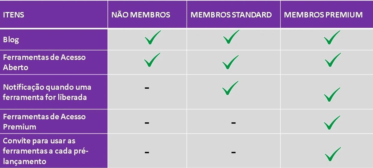 MEMBROS PREMIUM: são aqueles usuários que criaram uma conta (gratuita) na plataforma e realizam o pagamento da assinatura. Estes membros possuem acesso ilimitados às ferramentas e Soluções disponíveis.
